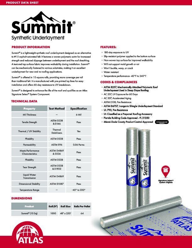 Summit®, Summit® 60, Summit® 180, and Gorilla Guard® synthetic underlayments are ideal for standard application for steep-slope roof assemblies. They are premium quality synthetic roof underlayments that provide 10 squares per roll, a benefit to wholesalers, shippers and installers alike. Woven scrim synthetic roof underlayment enhances tear resistance and lays flat while guarding against moisture and mold growth.